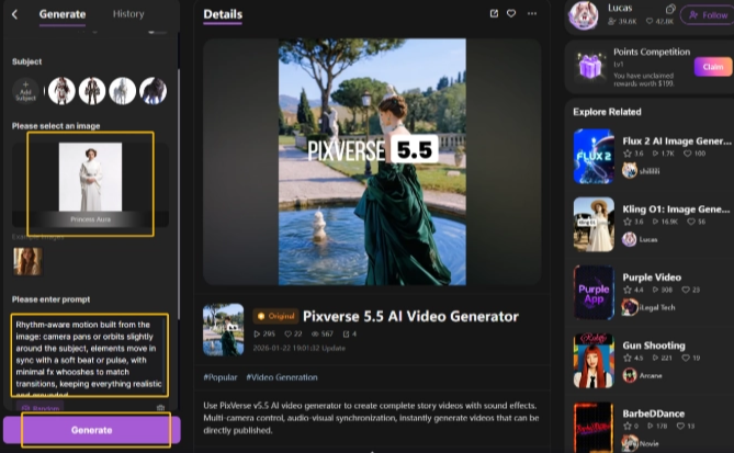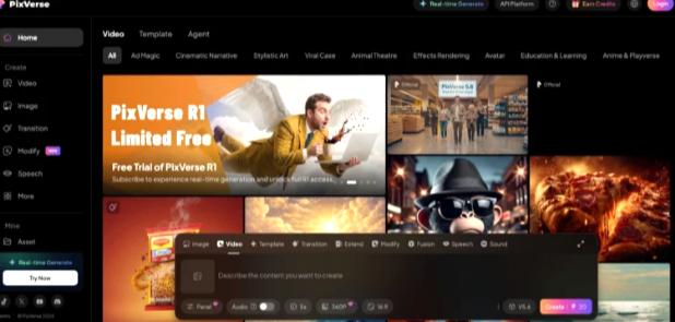 PixVerse предлагает два ключевых режима генерации контента: преобразование текста в видео и изображений в видео. Эти функции представляют собой основные инструменты для создания видео с использованием ИИ, которые позволяют быстро генерировать короткие видеоролики на основе заданных текстовых подсказок или анимировать статичные изображения.