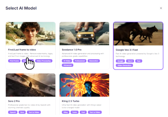 Выберите модель, которая поддерживает как текстовый, так и графический ввод. При желании, вы можете добавить изображения JPG или PNG для начальных или заключительных кадров (необязательно).