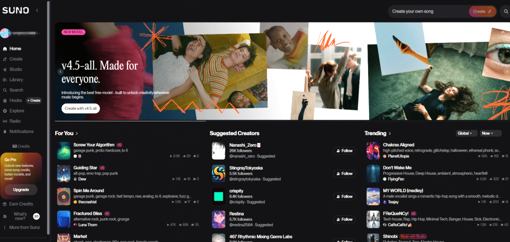 Работа в платных версиях Suno ai music позволяет пользователям сохранять приватность своих работ, скрывая их из общего каталога. В бесплатном варианте Suno ai music все сгенерированные композиции по умолчанию становятся публичными. Нейросеть стимулирует активное пополнение библиотеки сообщества Suno ai music, где можно изучать чужие промпты и настройки.